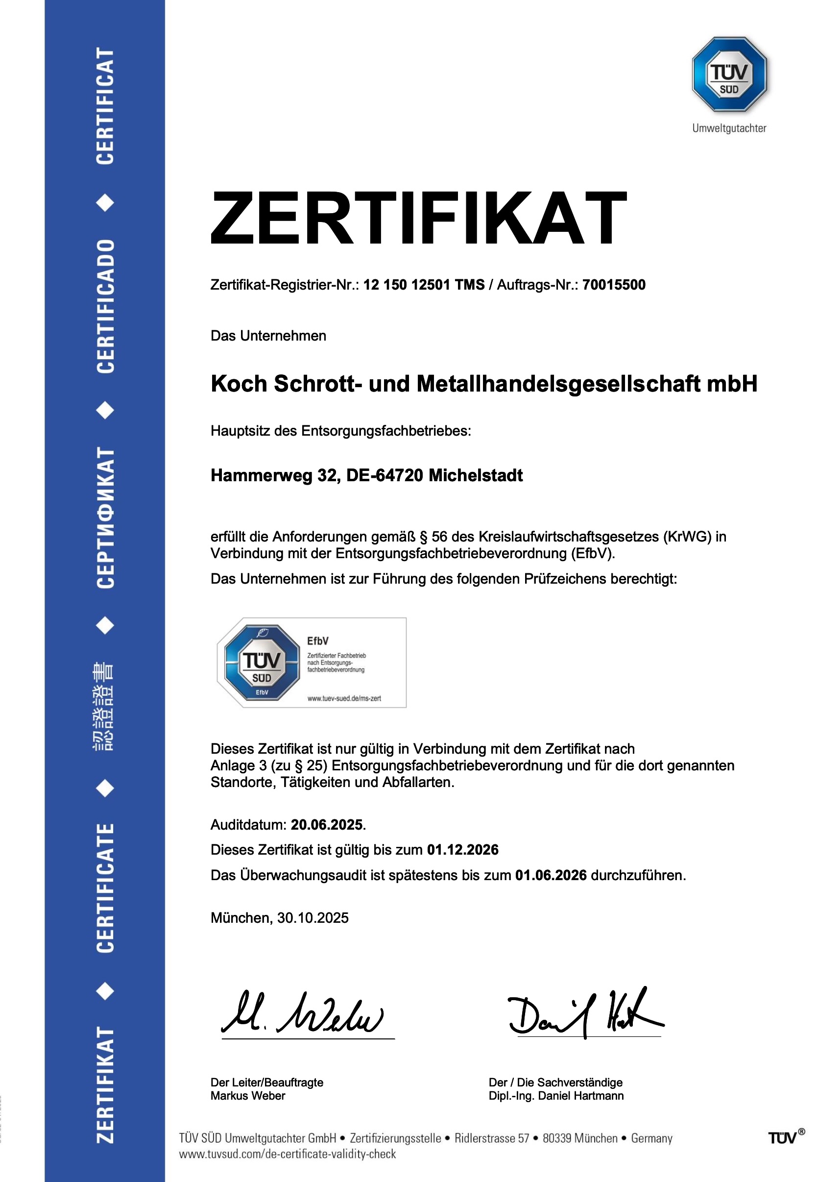 Die Geschäftstätigkeit der Firma Koch Schrott- und Metallhandelsgesellschaft mbH besteht aus dem Ankauf, der Lagerung und Bearbeitung von Schrott und Altmetallen, sowie der Behandlung von Altfahrzeugen und Elektro- und Elektronikaltgeräten am Unternehmensstandort Michelstadt / Odenwald, sowie den Verkauf hochwertiger Schrott- und Altmetallqualitäten.